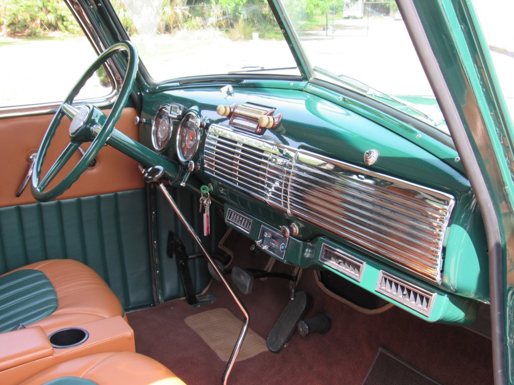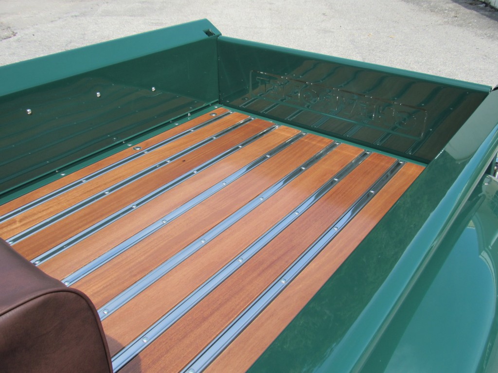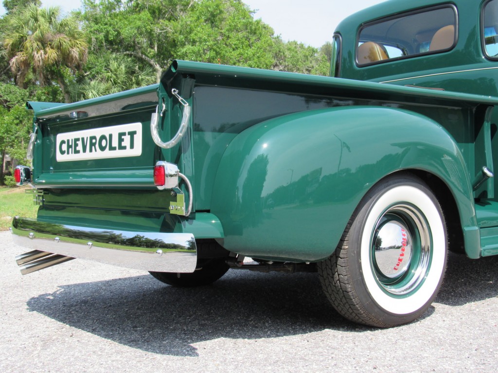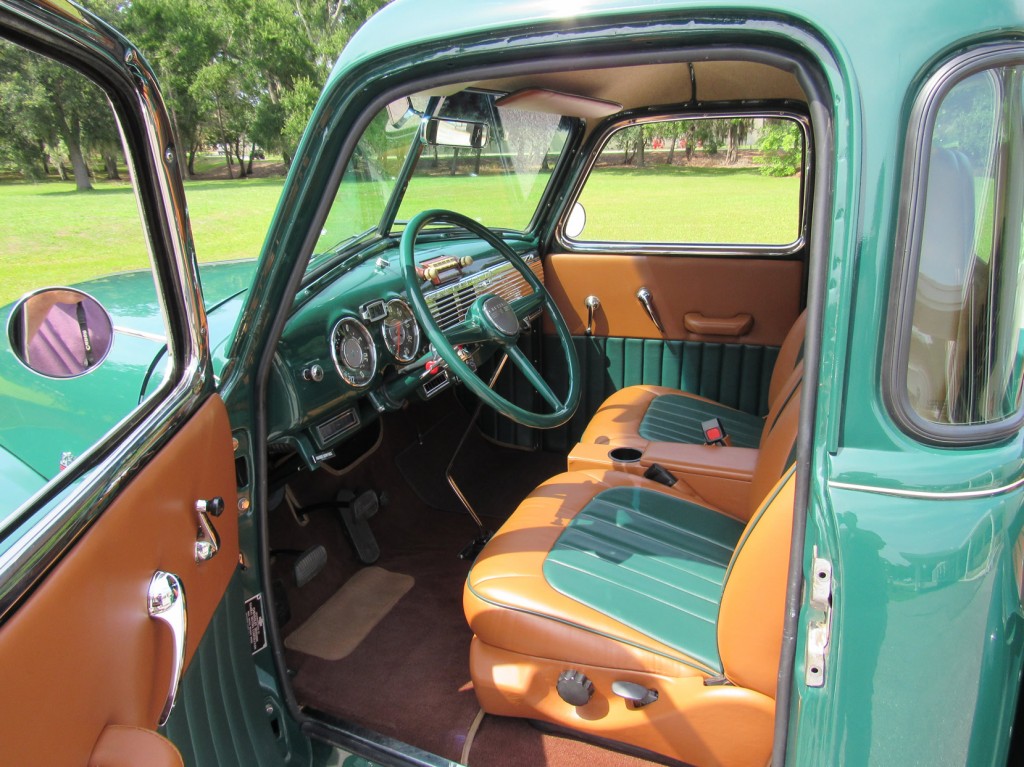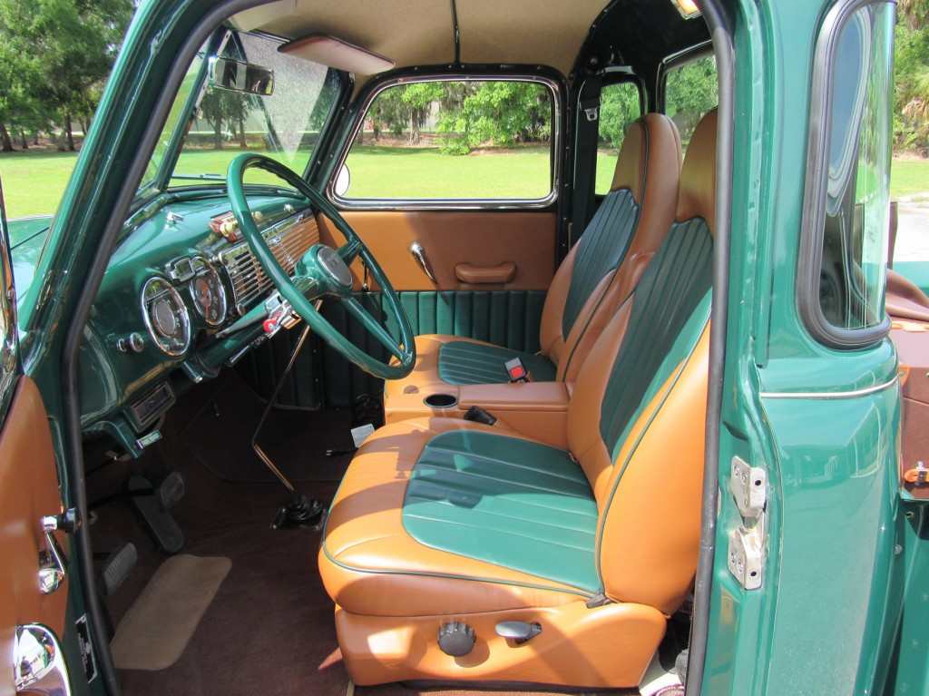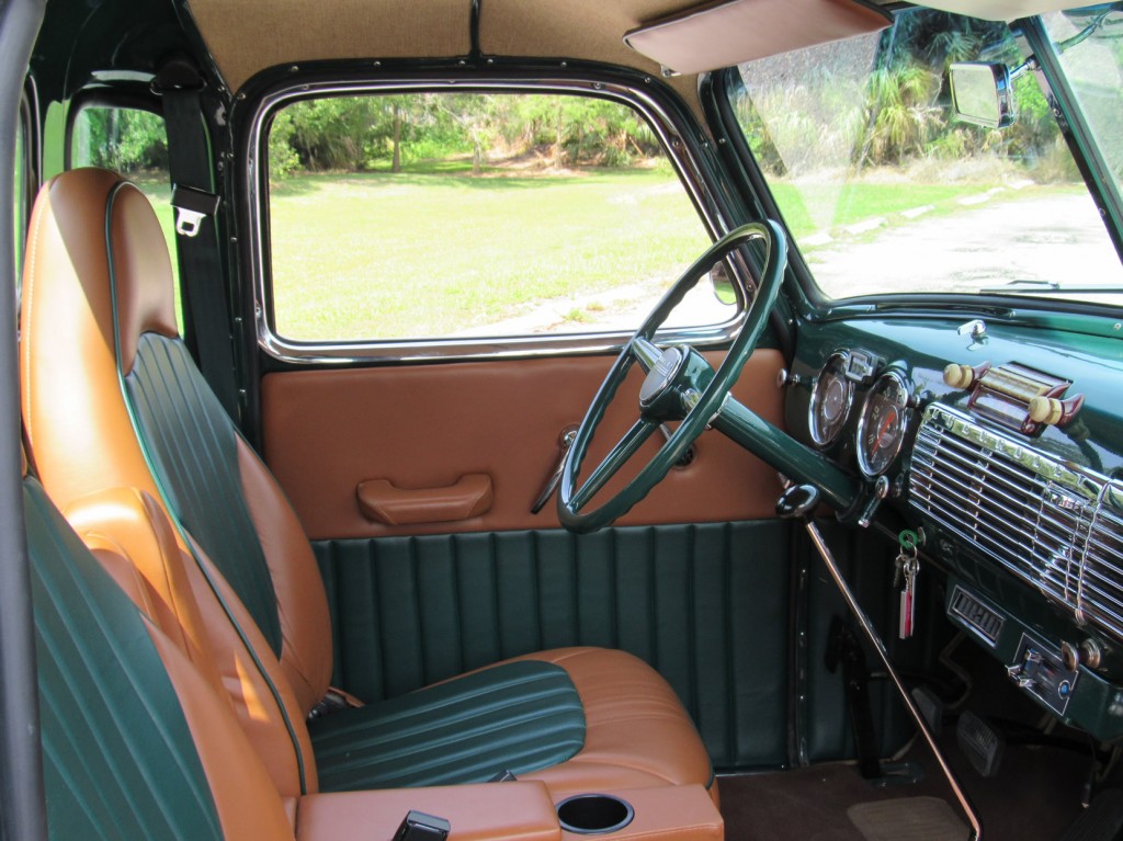 Chevrolet recognized that its trucks had to be more than workhorses, but also comfortable vehicles to drive. The automaker also recognized that the truck was no longer just a farm truck, but also driven as suburban transportation, with a greater number of women getting behind the wheel. Chevrolet marketed the truck with a new postwar approach. Chevy expanded the glass area of the 1947 models by 22 percent over the prewar designs. It also developed a new safety-glass technology. For the five-window Deluxe Cab models, Chevy marketed the feature as "Nu-Vue Rear-Corner Windows." These rear quarter-panel windows curved with the contour of the cab to eliminate the blind spot. Stylists finished all the windows with stainless steel trim.This 1948 5-window truck is a high-quality, frame-0ff restoration with upgrades in power and comfort and has been lowered 2”. It is powered by the 261ci 6-cylinder engine with a Fenton 2-carb intake and a Fenton split exhaust manifold plus a Saginaw 4-speed transmission. This truck also features power front disc brakes. The dark green paint with a small cream pin stripe around the belt line makes for an outstanding look. Moving to the bed you will find a highly polished mahogany wood floor with polished stainless divider strips. The bed also features a super nice leather storage trunk with a cover. The interior is breath taking with high quality green and dark tan high back bucket seats from a Ford Expedition with a console, cupholder and fold down inner arm rests. Interior features also includes professionally installed modern 134a air conditioning and heater unit, radio and 3-point seat belts. This great example has been converted to a 12-volt electrical system. It comes with extensive photos of the restoration and has just 2,500 miles on it since restoration was completed in 2015. Jump in this truck and go have hours of driving fun.
