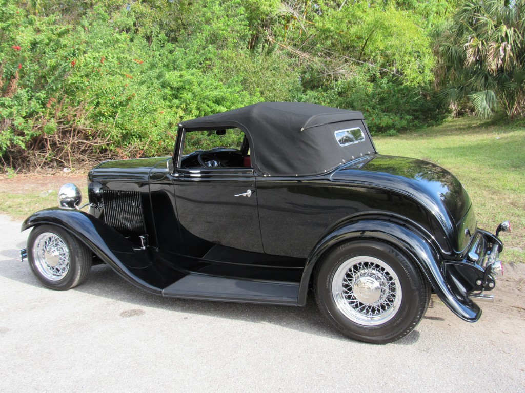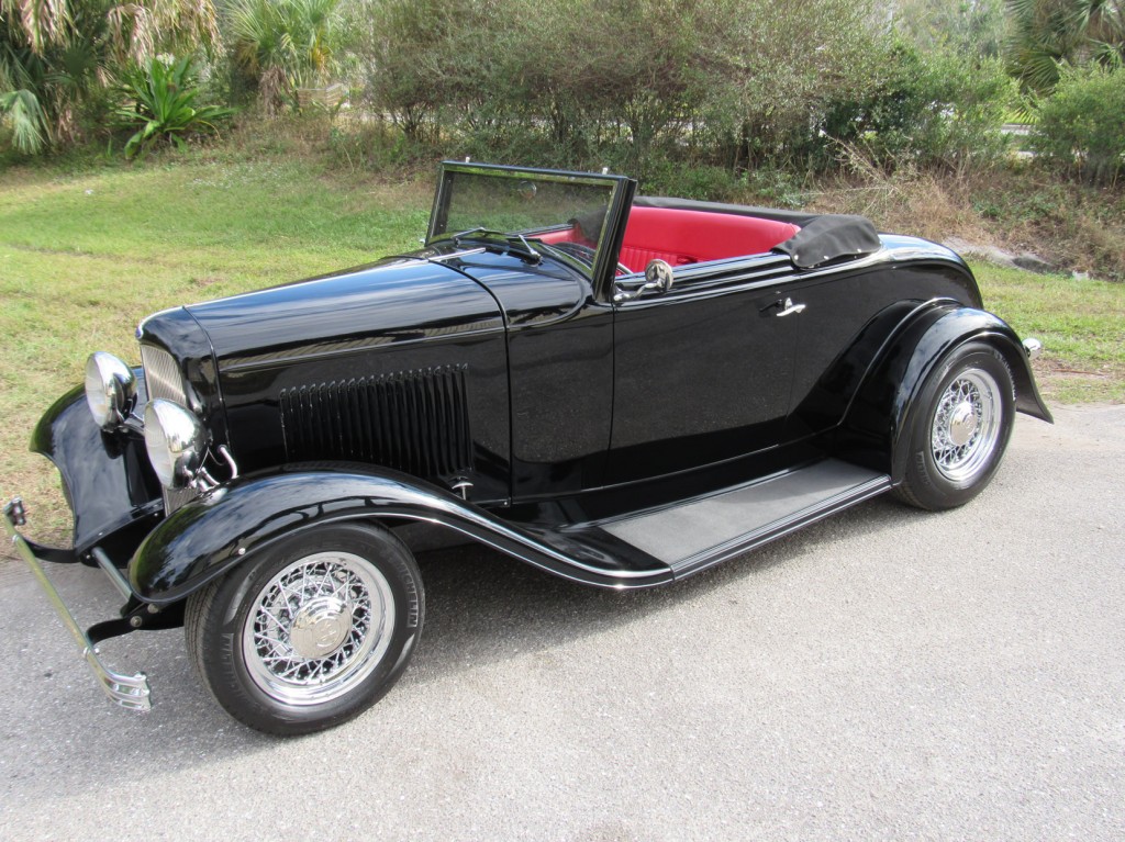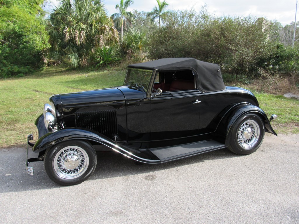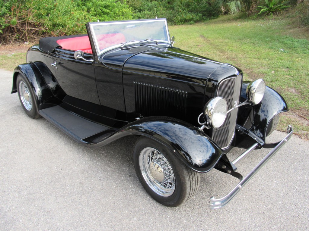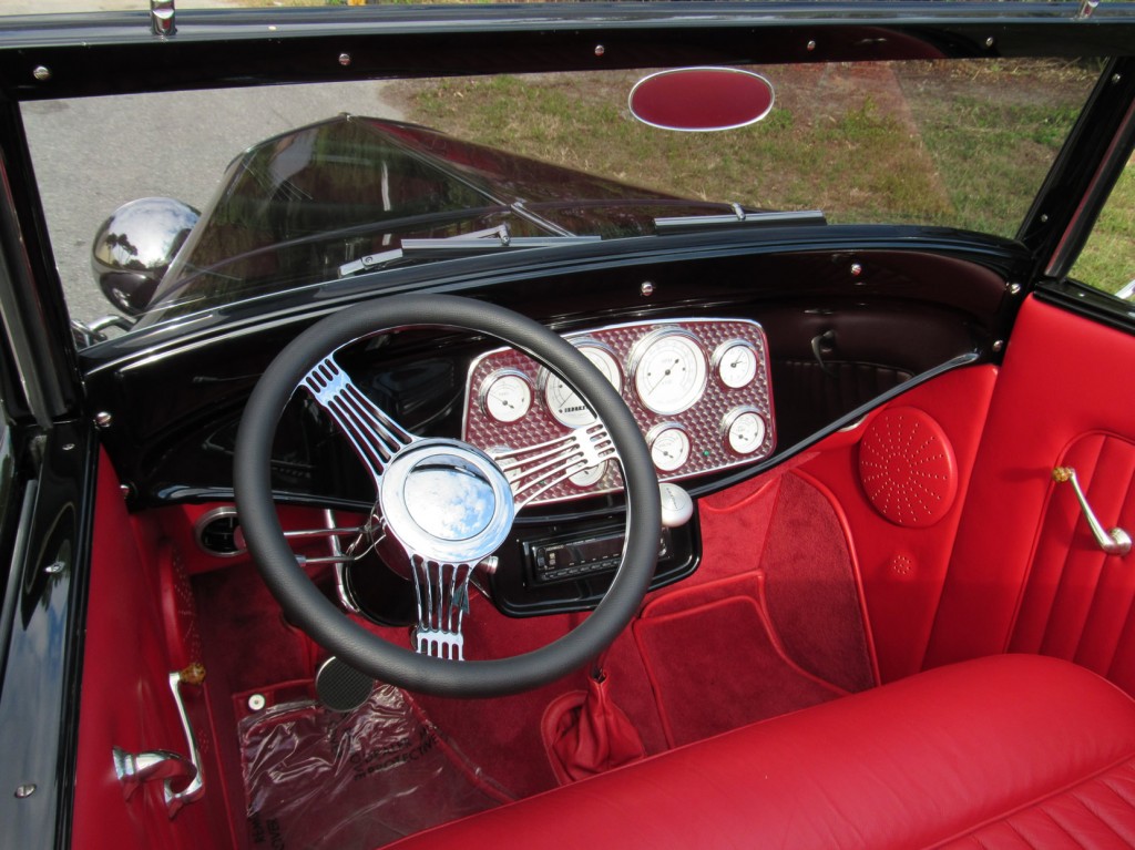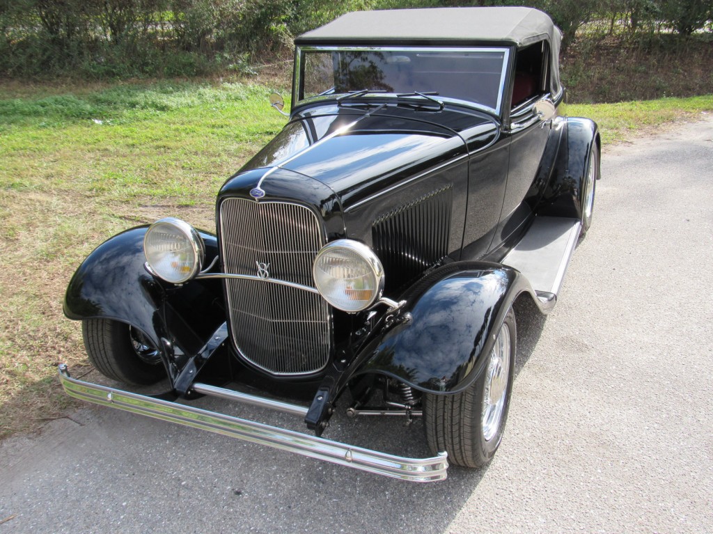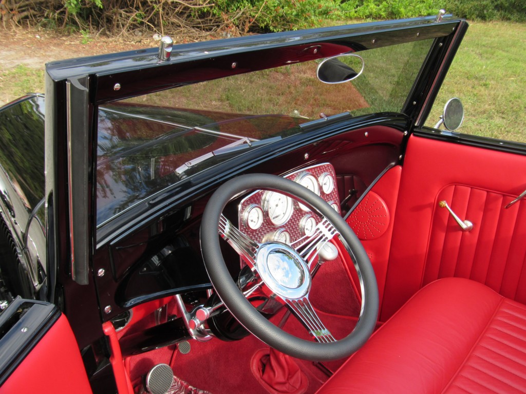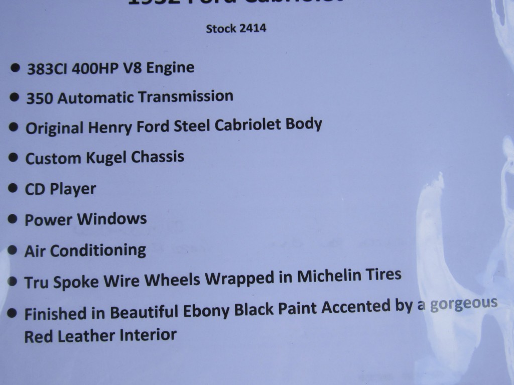1932 Ford Cabriolet. Finished in beautiful Ebony Black paint accented by a gorgeous Red leather interior. Powered by a 383CI 400HP V8 engine mated to a Turbo 350 automatic transmission. This amazing Hot Rod features an original Henry Ford Steel Cabriolet Body sitting on a custom Kugel Chassis with polished independent front coilover suspension, polished Jaguar style independent rear suspension, 4 wheel Wilwood Disc Brakes, Stainless Steel Exhaust, transmission cooler, leather seating surfaces, CD player, Ice Cold Air Conditioning, Lokar shifter, Classic Instruments gauges, tilt steering column,Tru Spoke wire wheels wrapped in Michelin Tires and much more. This is truly a Top Shelf build with over $165,000 of receipts for parts and pieces alone.