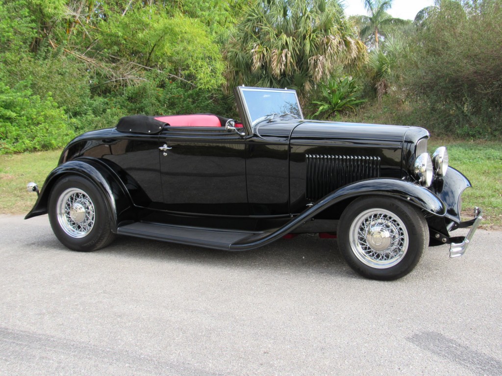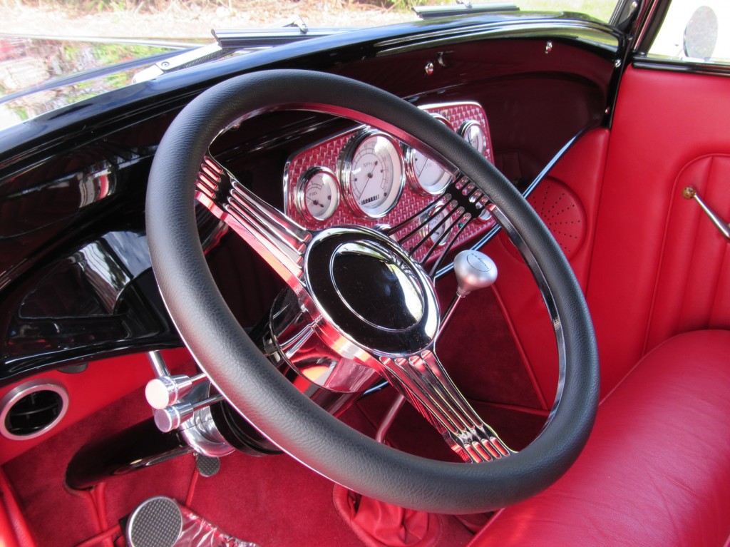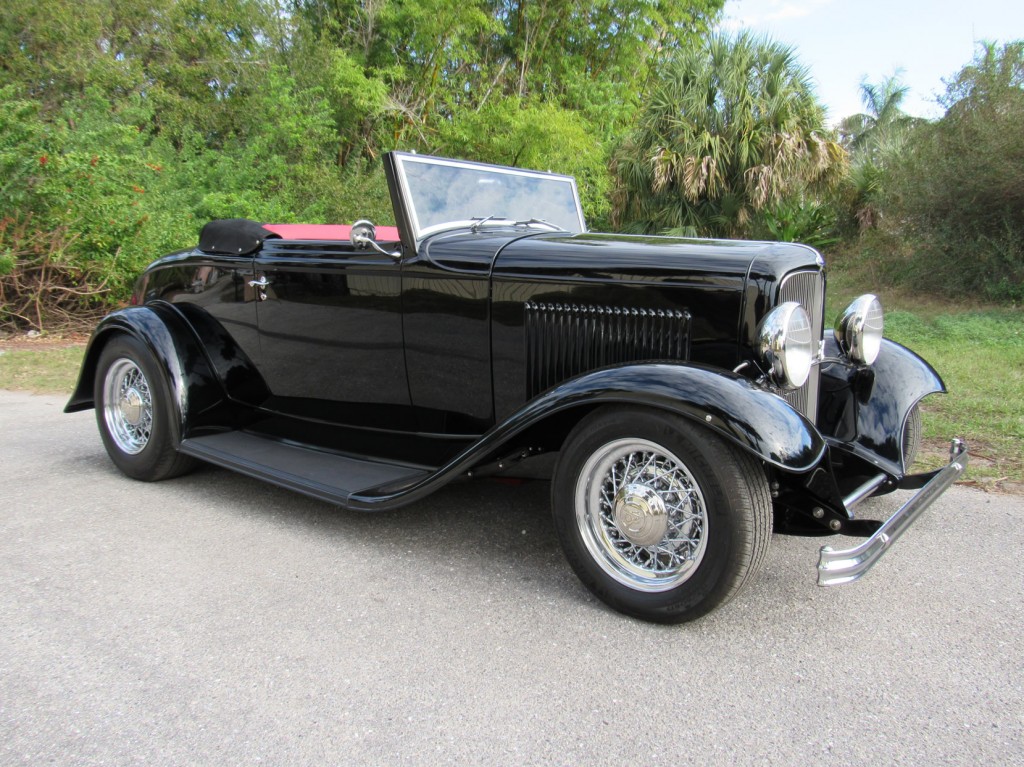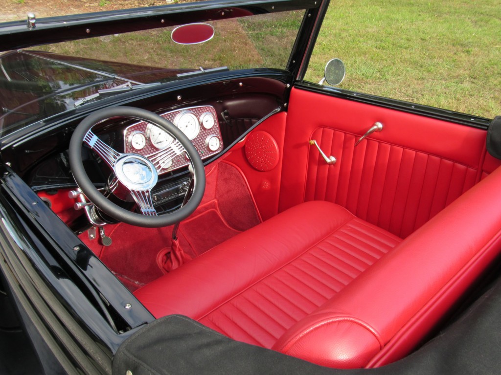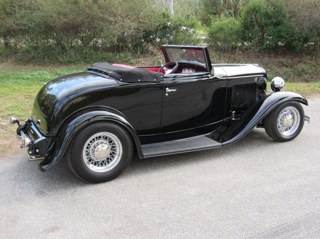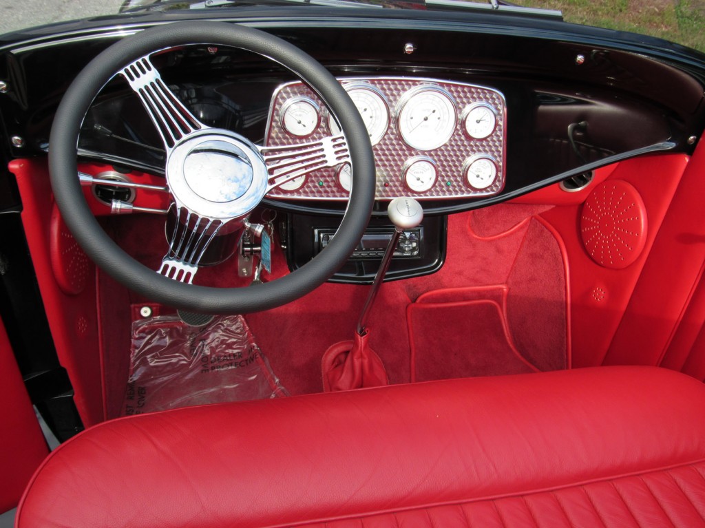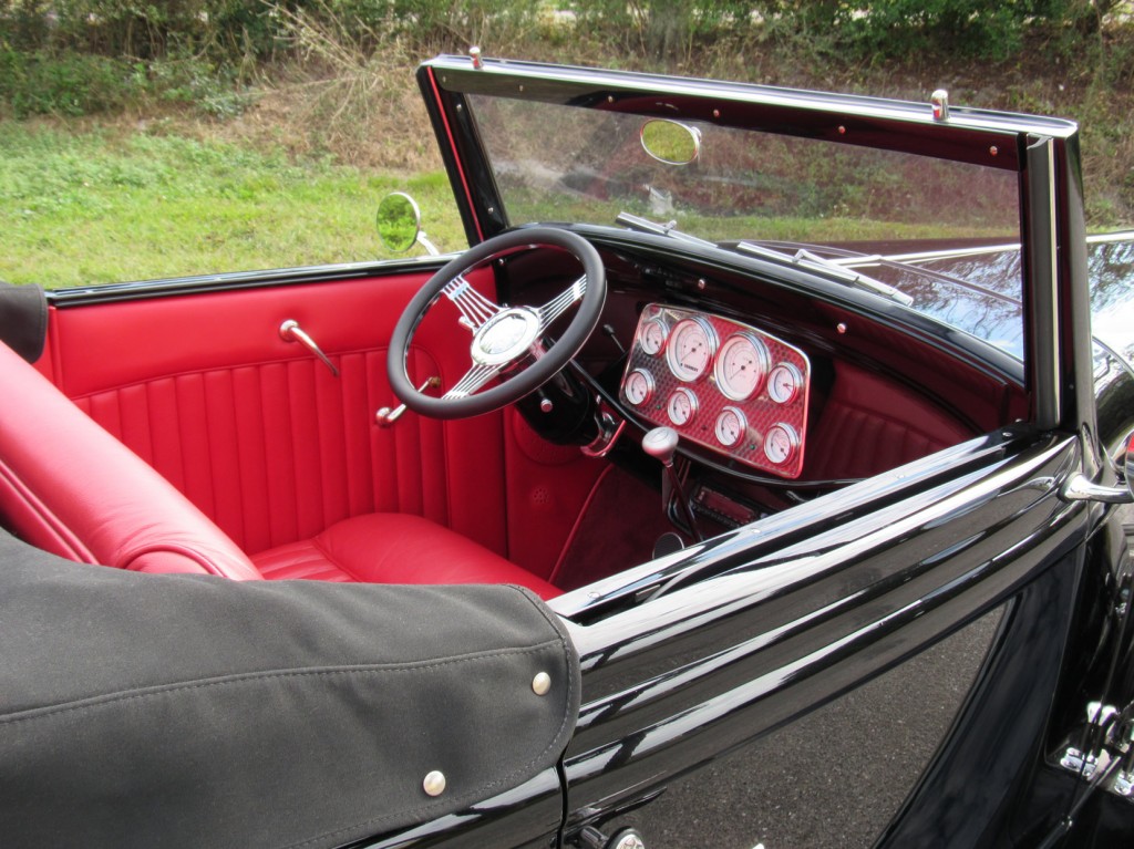1932 Ford Cabriolet. Finished in beautiful Ebony Black paint accented by a gorgeous Red leather interior. Powered by a 383CI 400HP V8 engine mated to a Turbo 350 automatic transmission. This amazing Hot Rod features an original Henry Ford Steel Cabriolet Body sitting on a custom Kugel Chassis with polished independent front coilover suspension, polished Jaguar style independent rear suspension, 4 wheel Wilwood Disc Brakes, Stainless Steel Exhaust, transmission cooler, leather seating surfaces, CD player, Ice Cold Air Conditioning, Lokar shifter, Classic Instruments gauges, tilt steering column,Tru Spoke wire wheels wrapped in Michelin Tires and much more. This is truly a Top Shelf build with over $165,000 of receipts for parts and pieces alone.