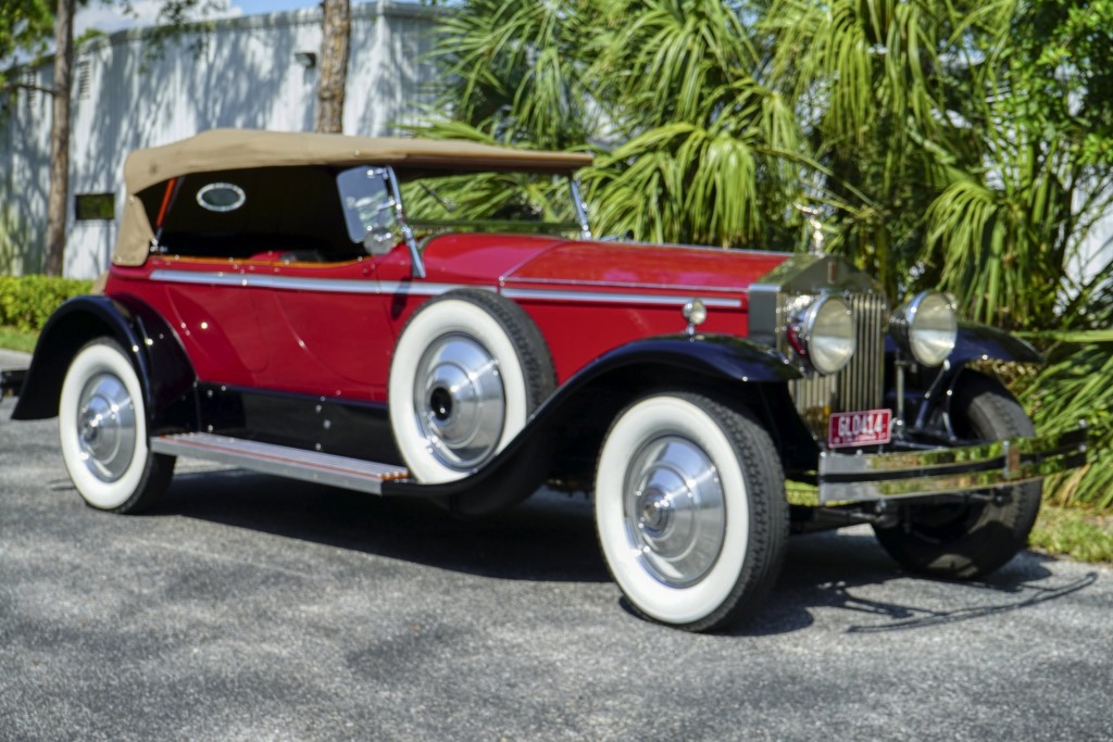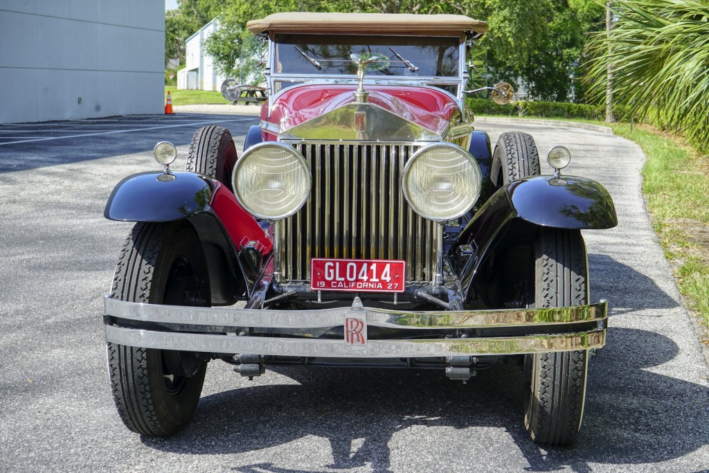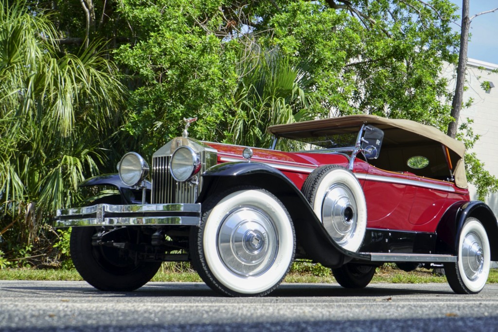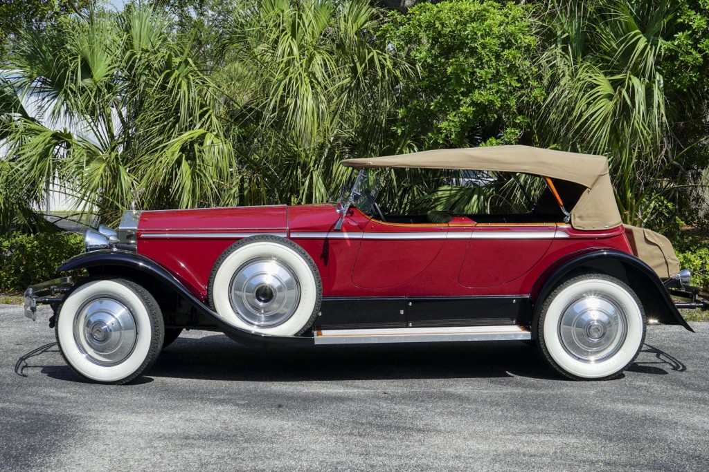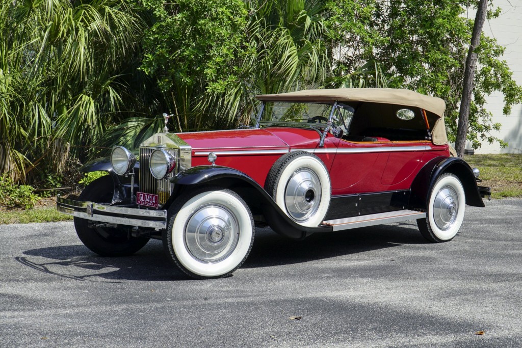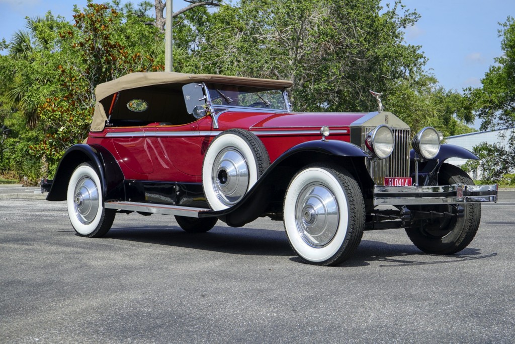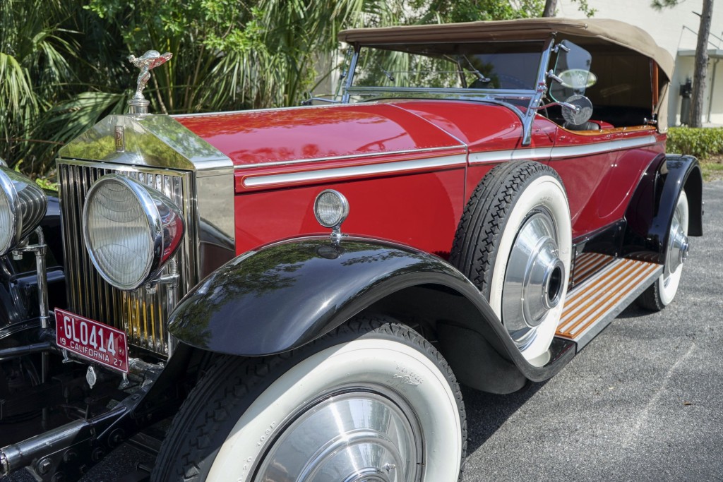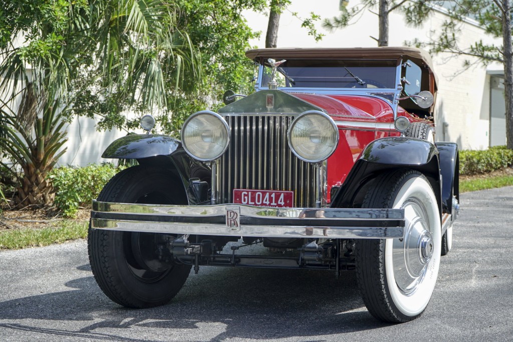 This Phantom I was delivered new to Hollywood actor Lewis Stone on Christmas Eve 1927, and it first wore an enclosed seven-passenger Arundel design by Brewster. After years of faithful service, in the early 1970s, the low-mileage, excellent-condition chassis was re-bodied in Australia, by Peter Lamm’s team of skilled coachbuilders, as an exact reproduction of another Brewster body, the Derby, which was a fully collapsible, four-passenger sporting body. From its sloping windshield, beautifully styled curved opening doors and full walnut capped interior surround to its distinctive dual side-mounted spares and its elegant oval rear window that culminates in its elegant rear quarters, this car exudes sporting yet tasteful elegance. It is now finished in bright red with a correct tan cloth top, matching full front and rear cockpit covers, complete window side curtain weather equipment with cloth colored rear beige finished wood trunk, and owners handbook, wheel and disc tools.