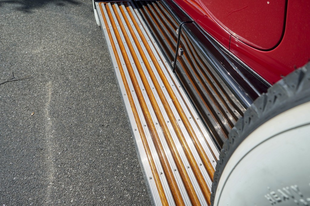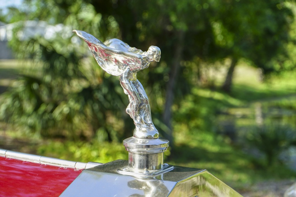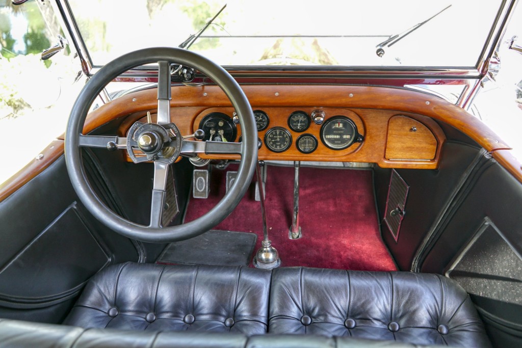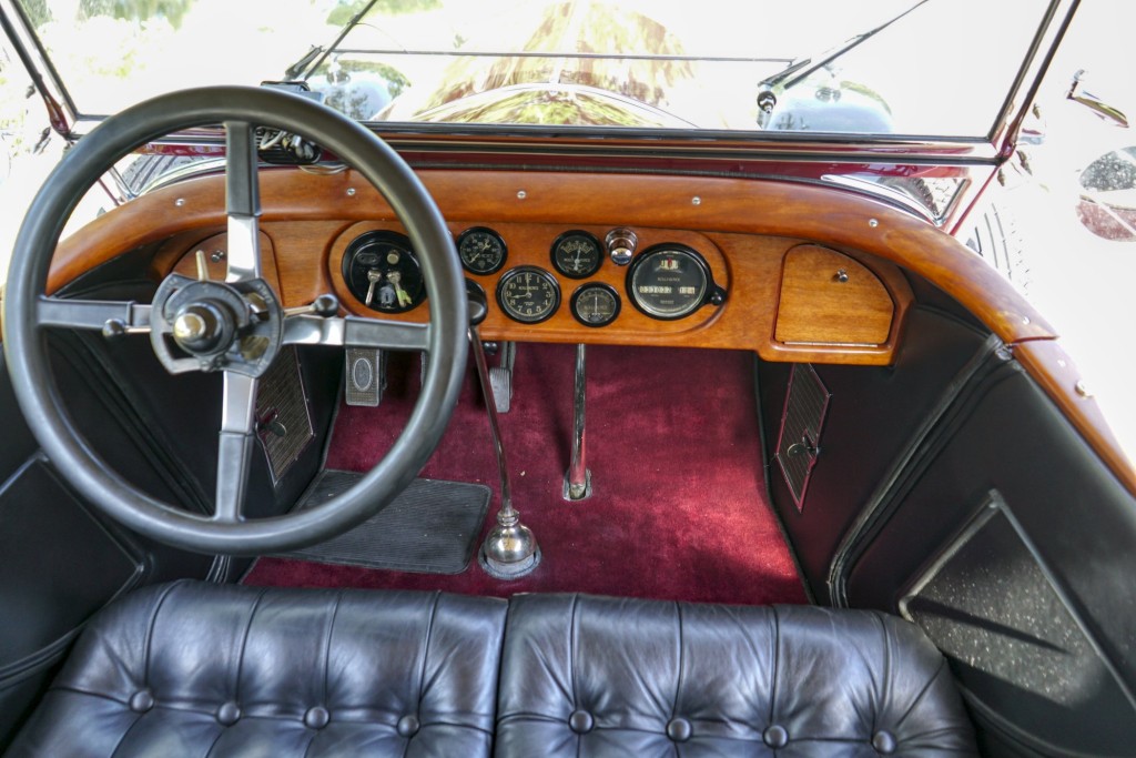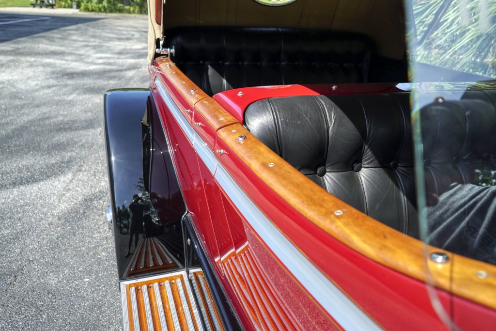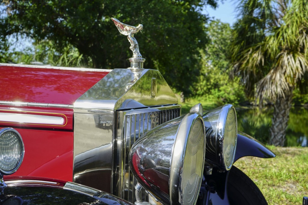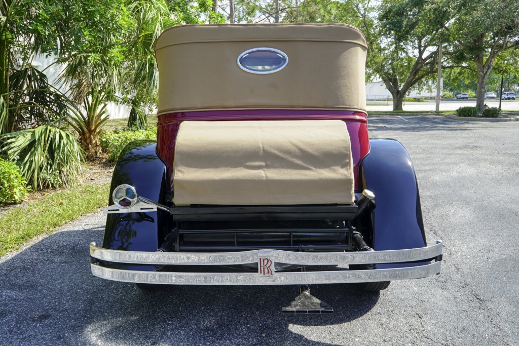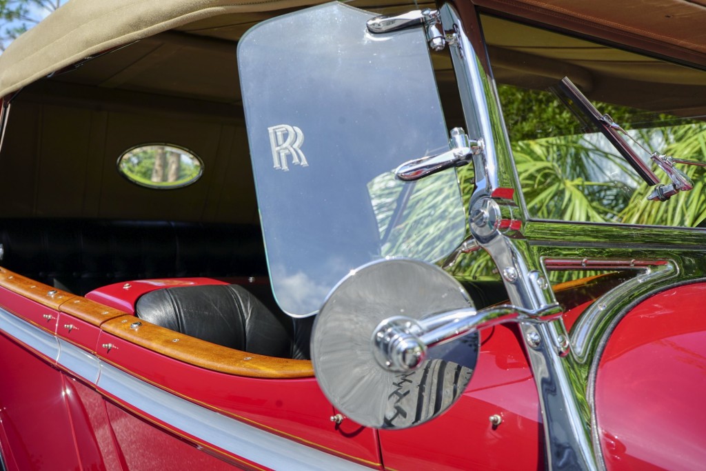 This Phantom I was delivered new to Hollywood actor Lewis Stone on Christmas Eve 1927, and it first wore an enclosed seven-passenger Arundel design by Brewster. After years of faithful service, in the early 1970s, the low-mileage, excellent-condition chassis was re-bodied in Australia, by Peter Lamm’s team of skilled coachbuilders, as an exact reproduction of another Brewster body, the Derby, which was a fully collapsible, four-passenger sporting body. From its sloping windshield, beautifully styled curved opening doors and full walnut capped interior surround to its distinctive dual side-mounted spares and its elegant oval rear window that culminates in its elegant rear quarters, this car exudes sporting yet tasteful elegance. It is now finished in bright red with a correct tan cloth top, matching full front and rear cockpit covers, complete window side curtain weather equipment with cloth colored rear beige finished wood trunk, and owners handbook, wheel and disc tools.