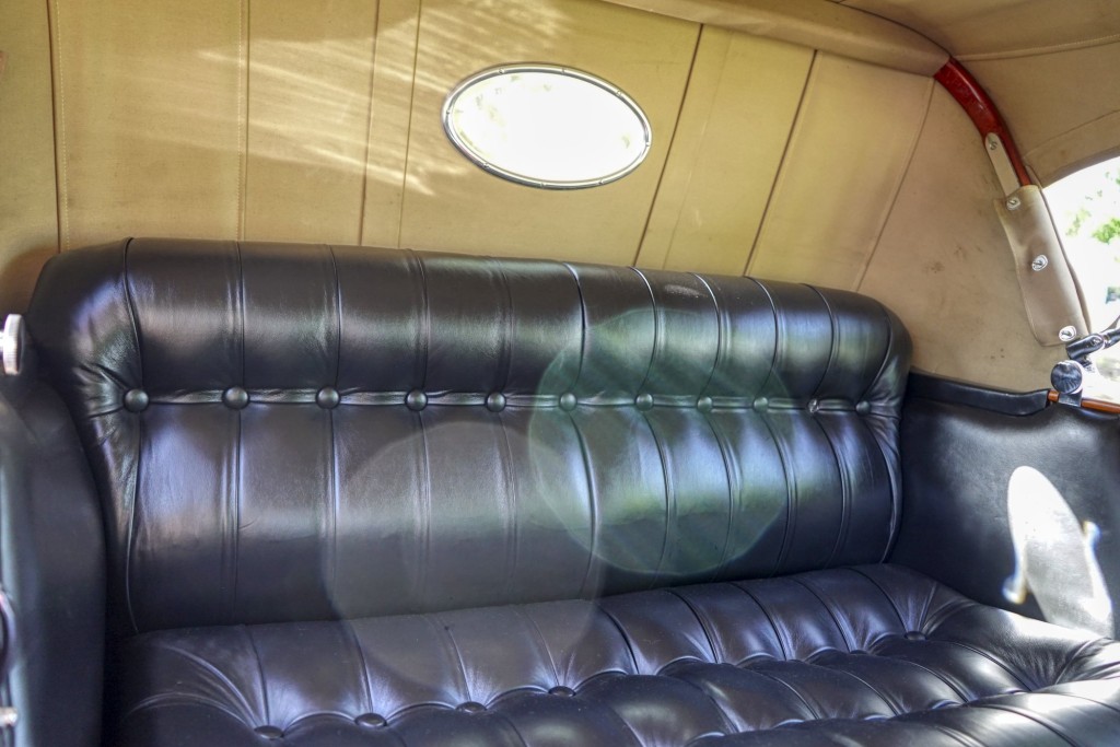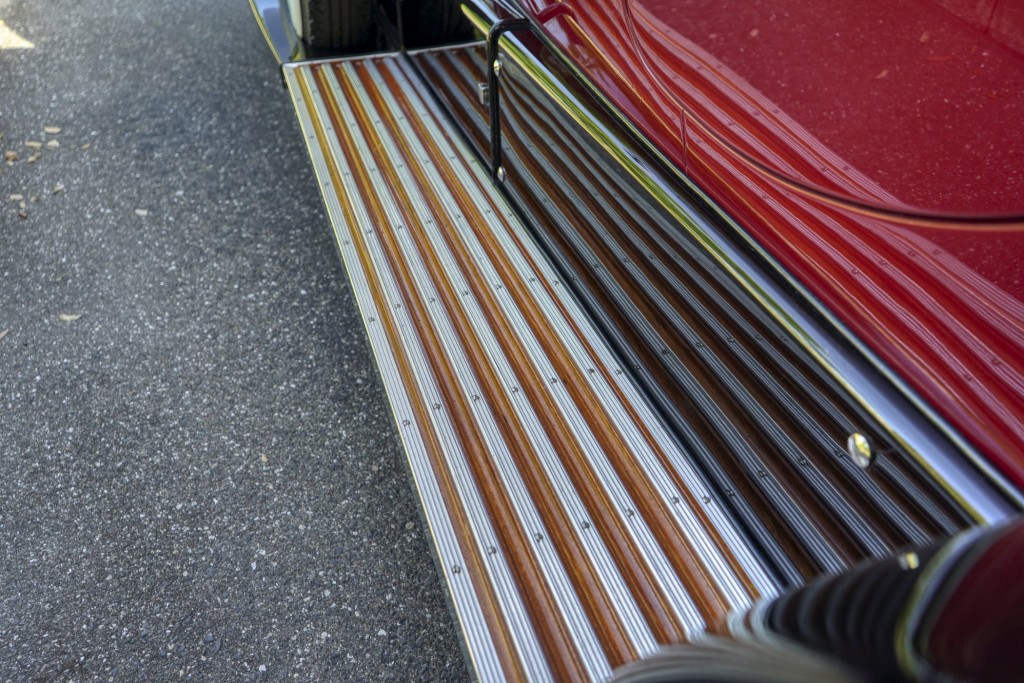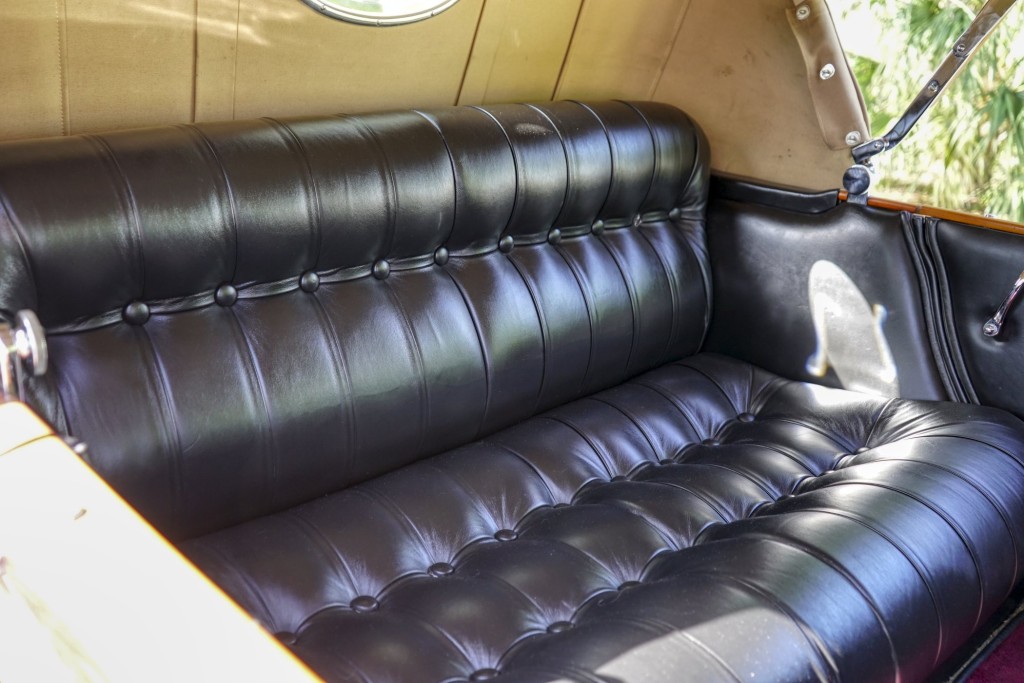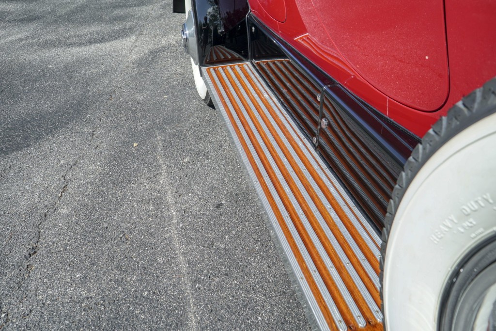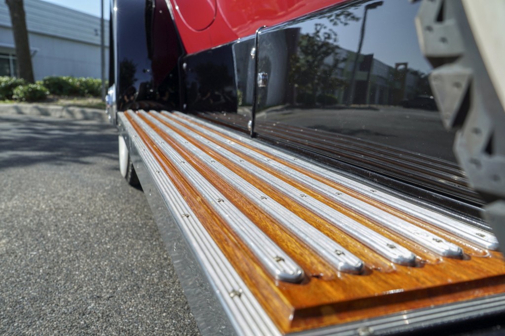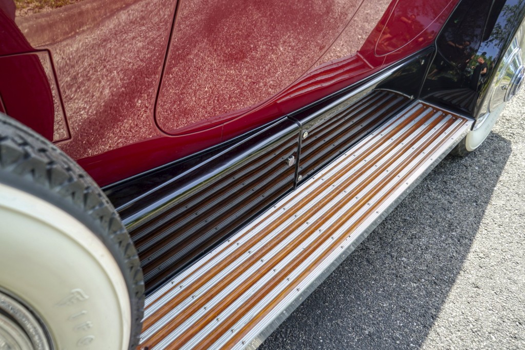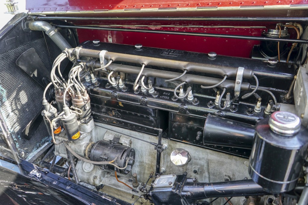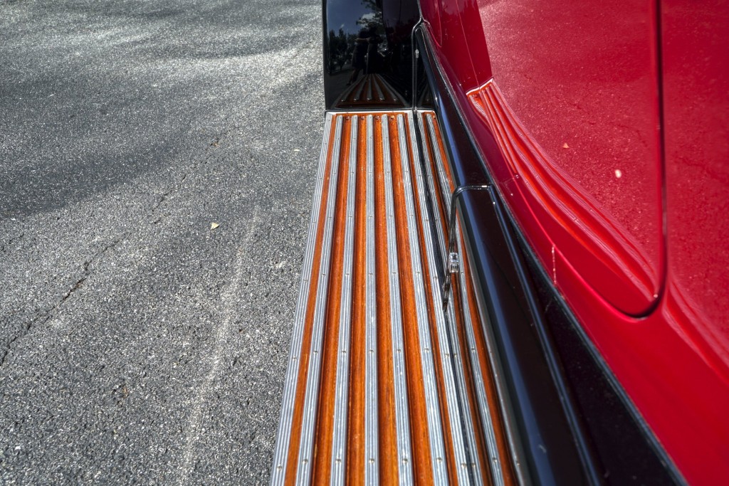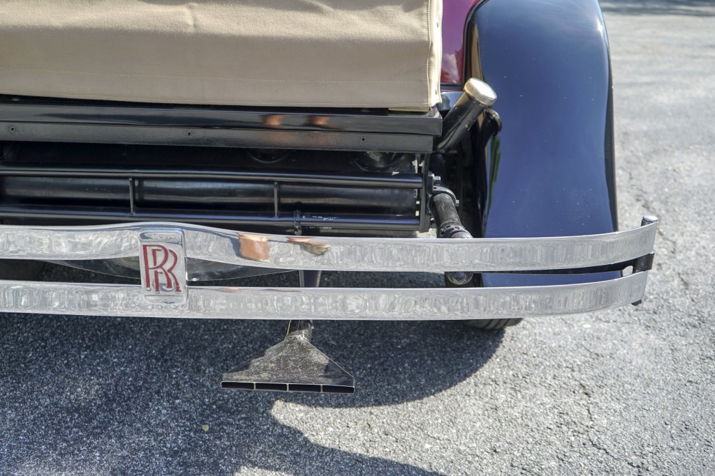 This Phantom I was delivered new to Hollywood actor Lewis Stone on Christmas Eve 1927, and it first wore an enclosed seven-passenger Arundel design by Brewster. After years of faithful service, in the early 1970s, the low-mileage, excellent-condition chassis was re-bodied in Australia, by Peter Lamm’s team of skilled coachbuilders, as an exact reproduction of another Brewster body, the Derby, which was a fully collapsible, four-passenger sporting body. From its sloping windshield, beautifully styled curved opening doors and full walnut capped interior surround to its distinctive dual side-mounted spares and its elegant oval rear window that culminates in its elegant rear quarters, this car exudes sporting yet tasteful elegance. It is now finished in bright red with a correct tan cloth top, matching full front and rear cockpit covers, complete window side curtain weather equipment with cloth colored rear beige finished wood trunk, and owners handbook, wheel and disc tools.