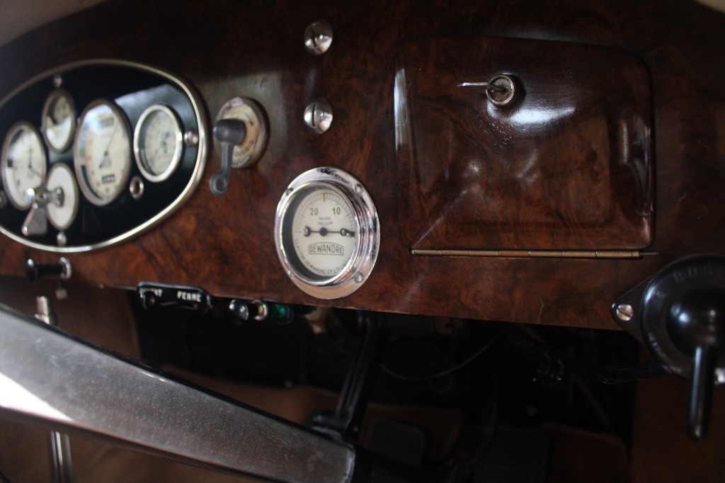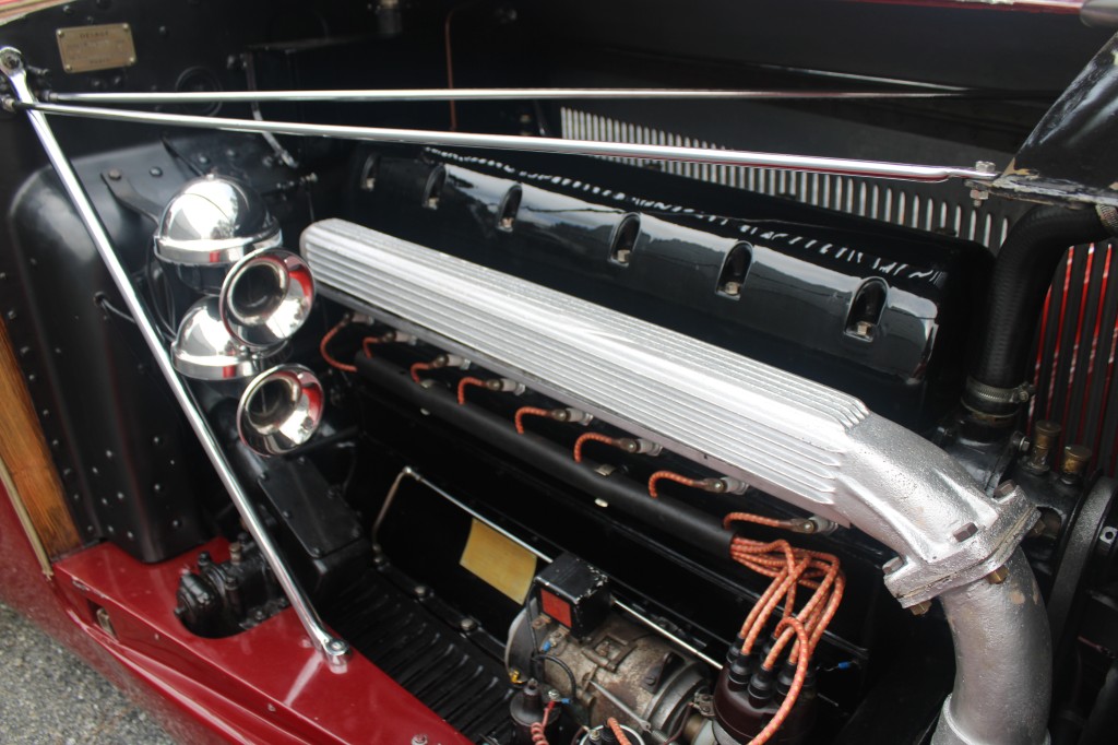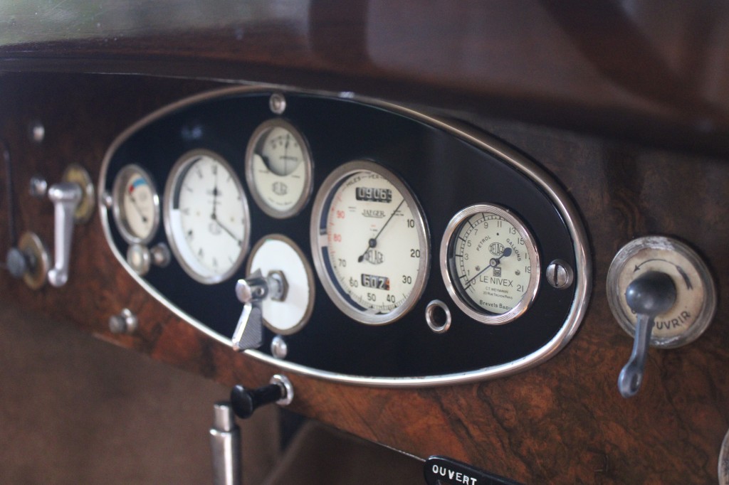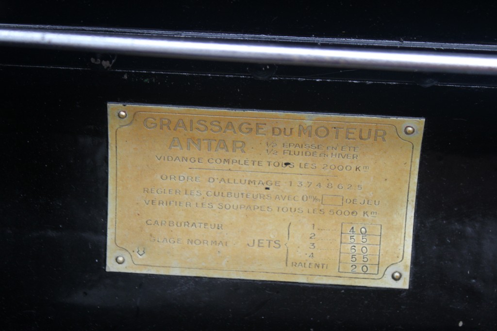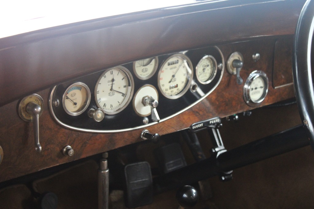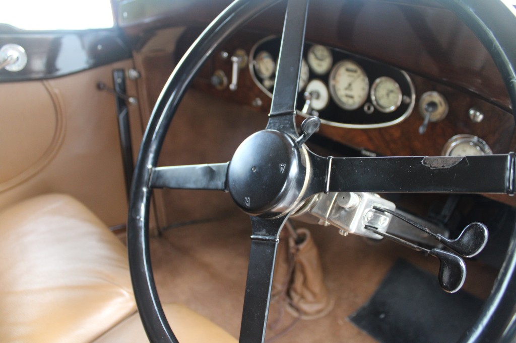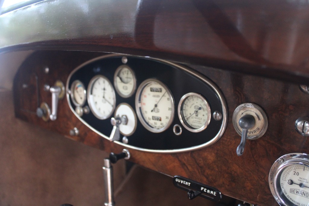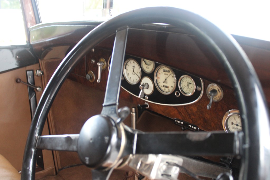 This two-door four seater faux cabriolet was constructed by Vanvooren using the patented Silentbloc vibration-isolating mounting system. The body is steel apart from the bonnet, which is aluminum. The four SU carburetors hint at its British market origins, and the mighty straight-eight engine sends its 120 horsepower to the ground via a four-speed gearbox. Dewandre servo-assisted hydraulic drum brakes provide ample stopping power. Other notable features of this particular car include twin rear-mounted mudguards, and short steps rather than a full-length running board.